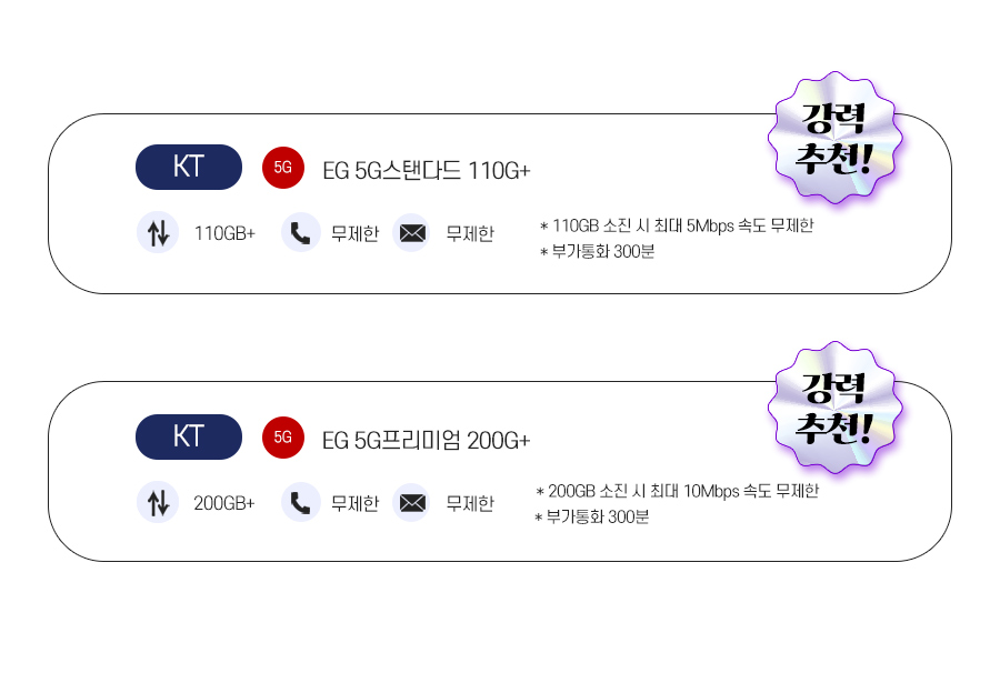 | EG 5G스탠다드 110G+ | 110GB+ | 기본제공 | 기본제공 | 월 51,700원 월 16,900원 7개월이후 평생 51,700원 |
