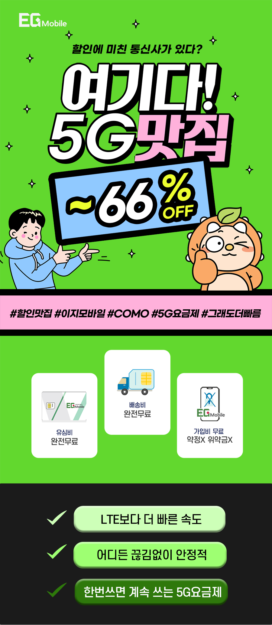 | EG 5G 심플 70GB+ | 70GB+ | 기본제공 | 기본제공 | 월 47,300원 월 14,900원 7개월이후 평생 47,300원 |