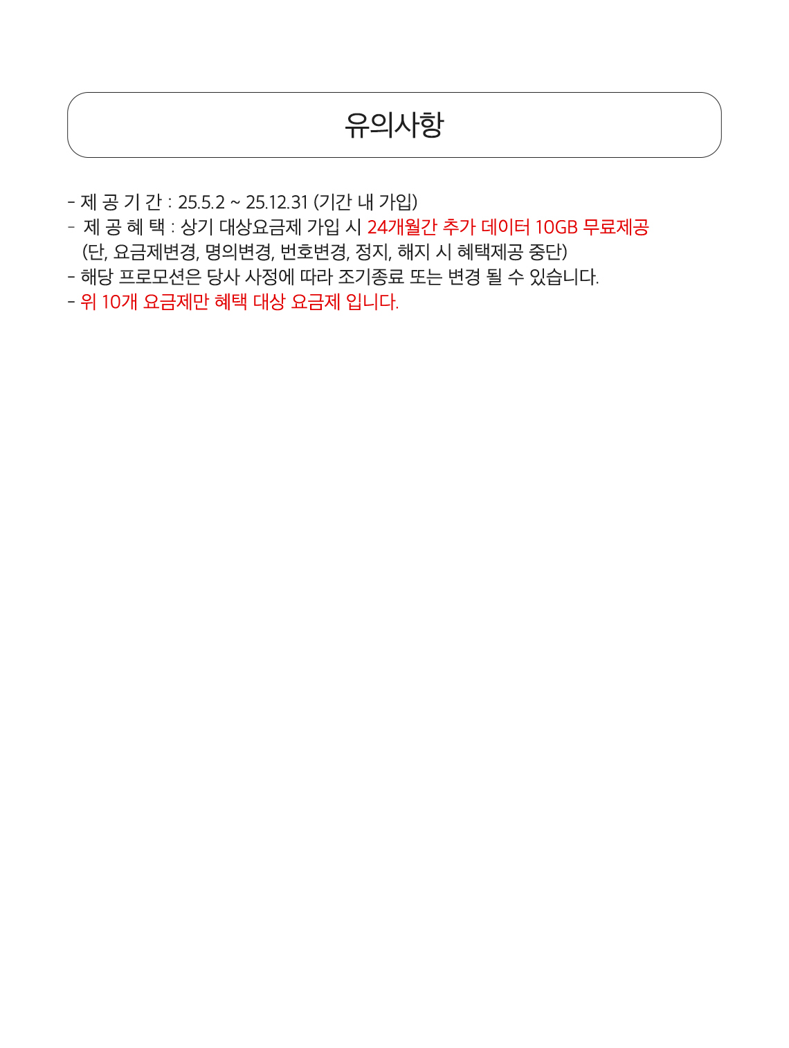 | 오래쓰는 무제한 10G+1(밀리의 서재) | 10GB+추가 데이터 10GB 무료제공[24개월간] | 기본제공 | 기본제공 | 월 24,200원 월 13,970원 12개월이후 평생 24,200원 |